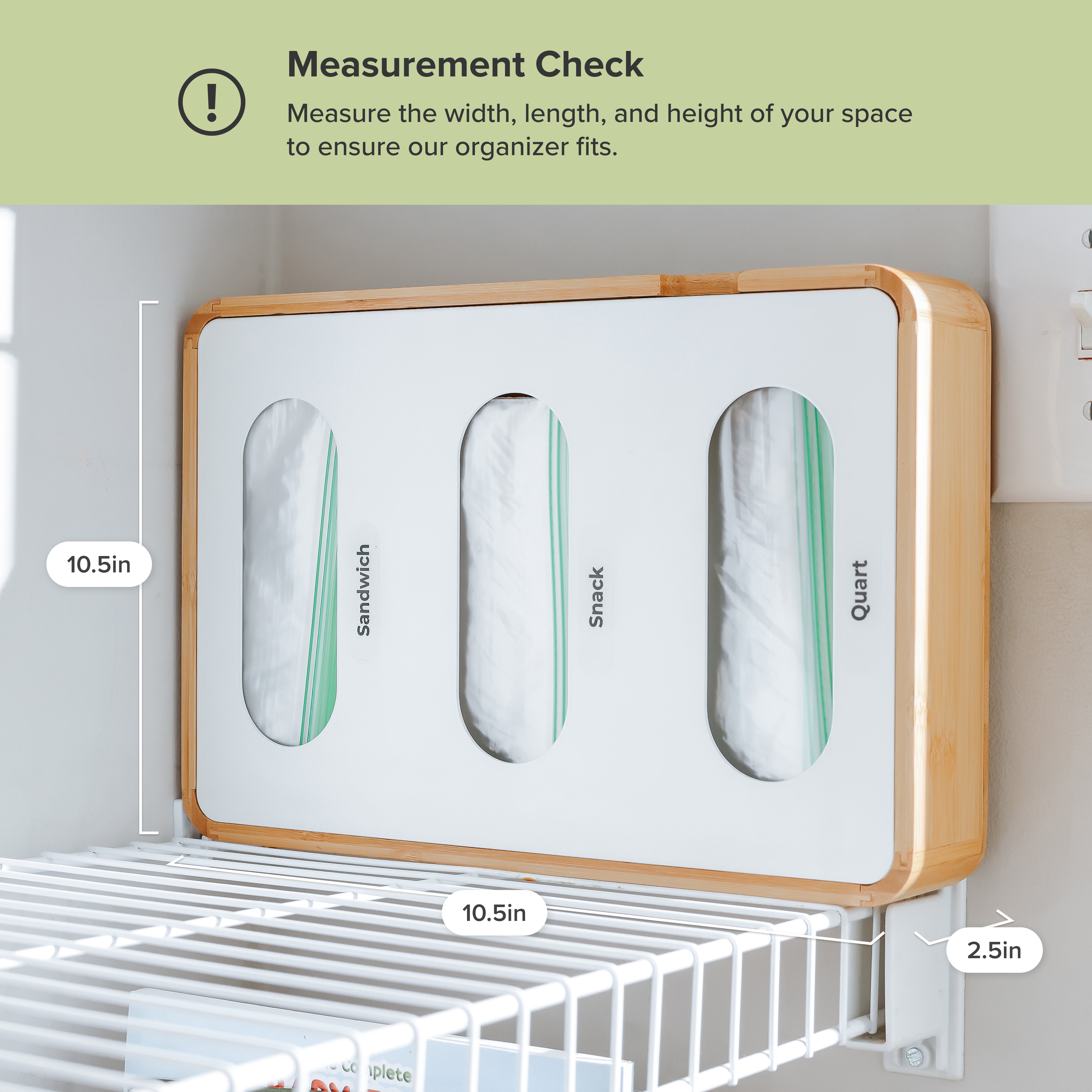 Keep everyday bag sizes neatly arranged with this 3-slot bamboo and metal ziplock bag organizer. Designed for snack, sandwich, and quart bags, the deep compartments provide generous storage while maintaining a tidy layout. The magnetic white metal top can be reinforced with extra-security adhesive when mounted vertically, and rubber feet add stability in drawers while protecting walls from scratches. Whether used flat, upright, or on the wall, the orientation-ready hanging holes make setup simple. Screws, anchors, and sticker labels are included to complete your kitchen organization system.