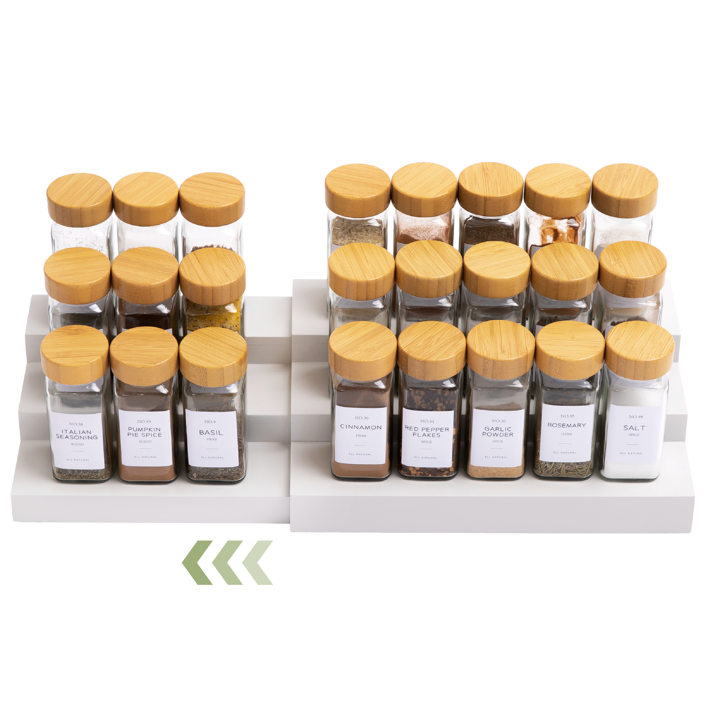 Upgrade your spice organization with this white-painted bamboo spice rack organizer, designed for cabinet storage and versatile enough for pantry or kitchen use. Its fresh white finish, durable bamboo construction, and adaptable design make it a stylish and essential addition to any organized kitchen.