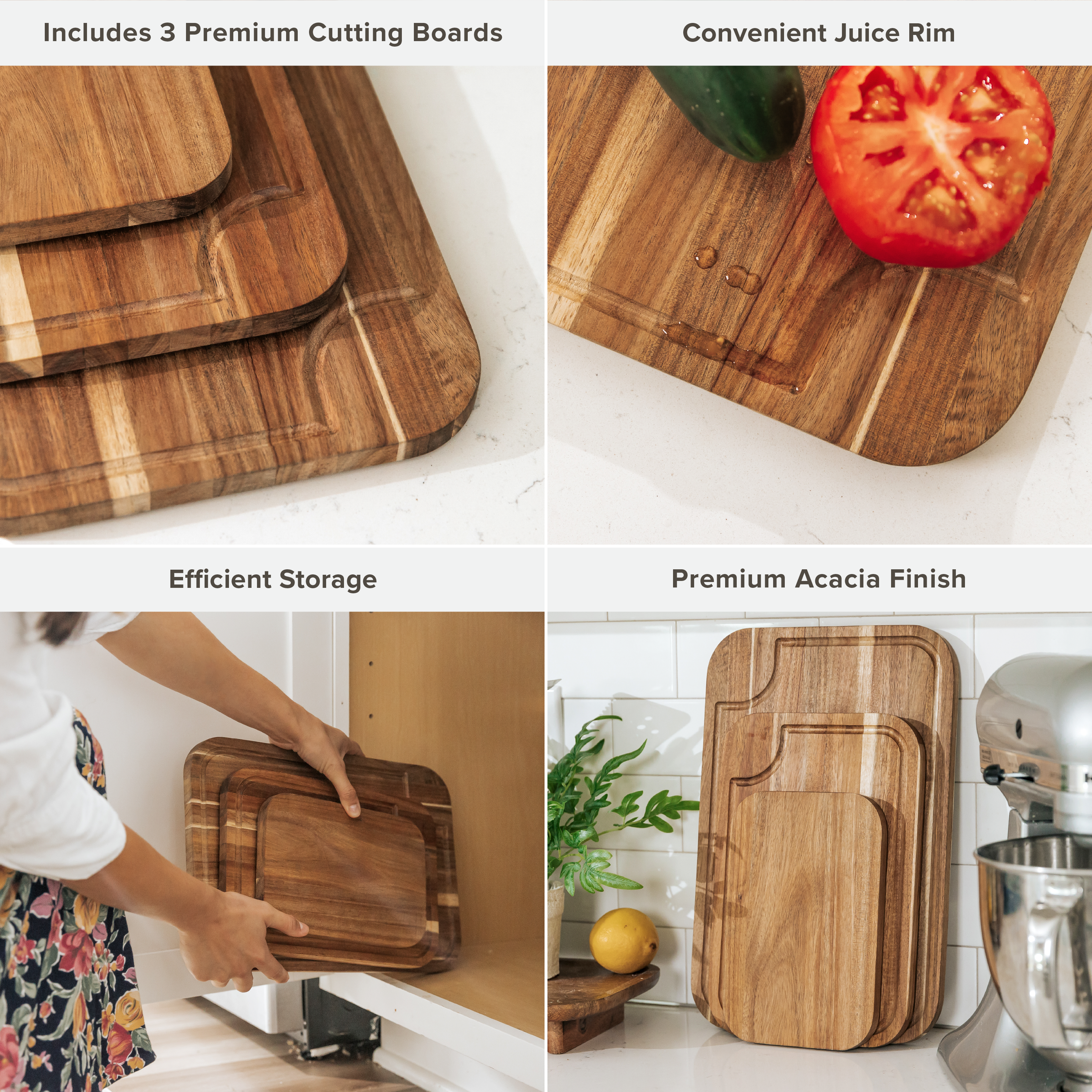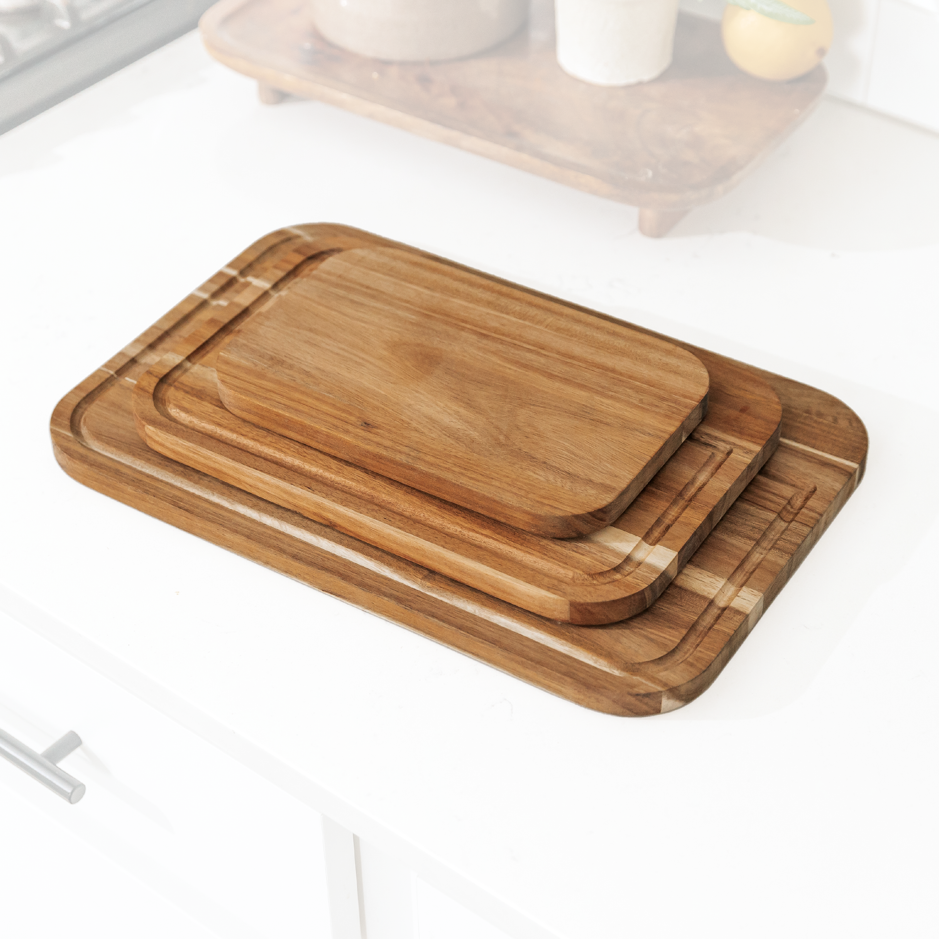 Discover our 3-Piece Acacia Cutting Board Set, combining style and durability. Made from sturdy acacia wood, each board has rubber feet for stability and juice rims for mess-free use. This set enhances your cooking with functional design and easy upkeep, perfect for various kitchen tasks. Pre-oiled for immediate use, maintain with mineral oil to prolong their life.