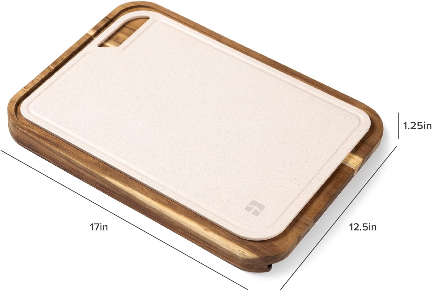 Designed For The Chef In You - Has uniquely crafted edges that firmly hold the rice fiber insert in place, ensuring even cuts. The durable rubber feet provide added stability for precision - Sustainably Crafted - This eco-friendly cutting board is made from rapidly growing acacia and rice fiber, transforming rice processing waste into a functional cutting board