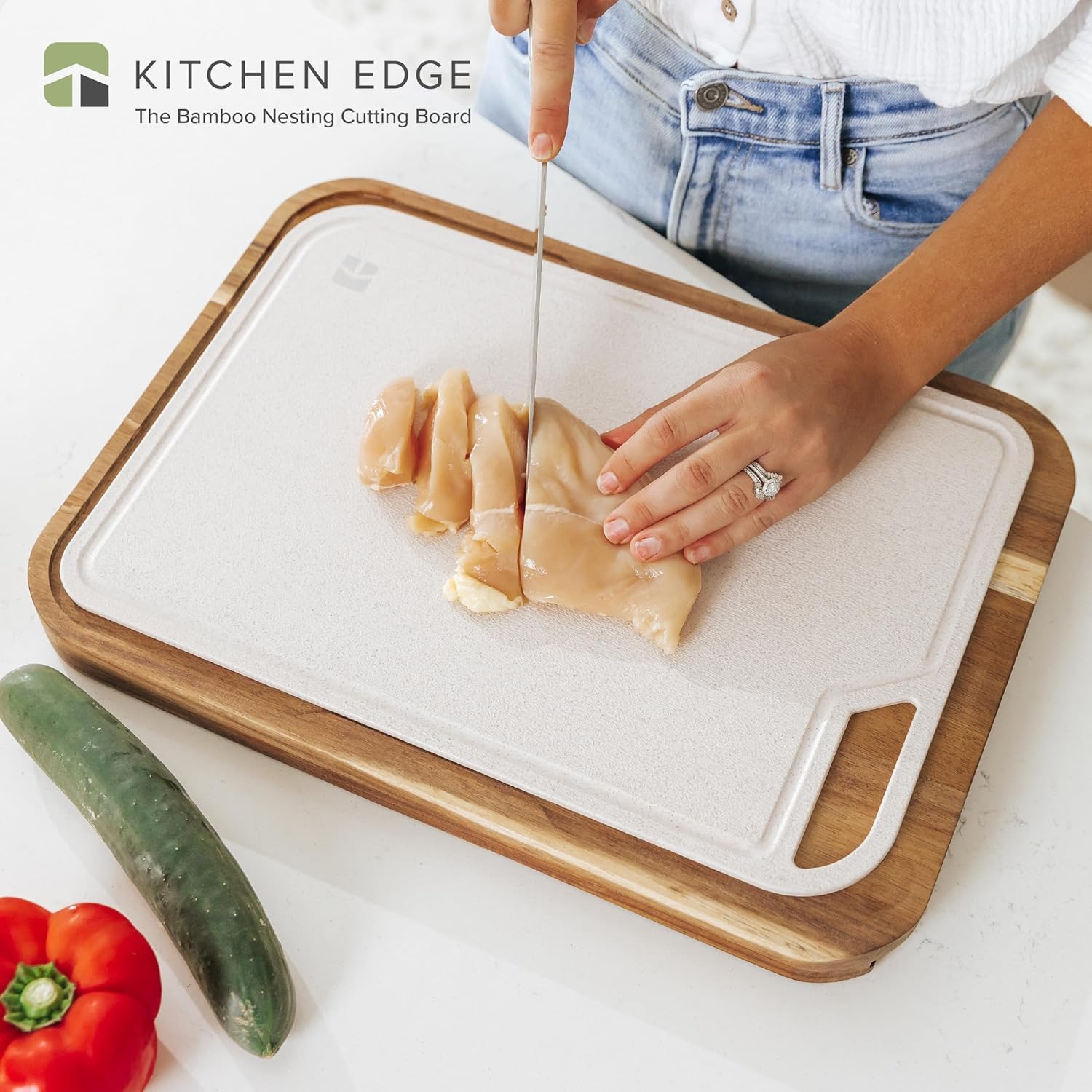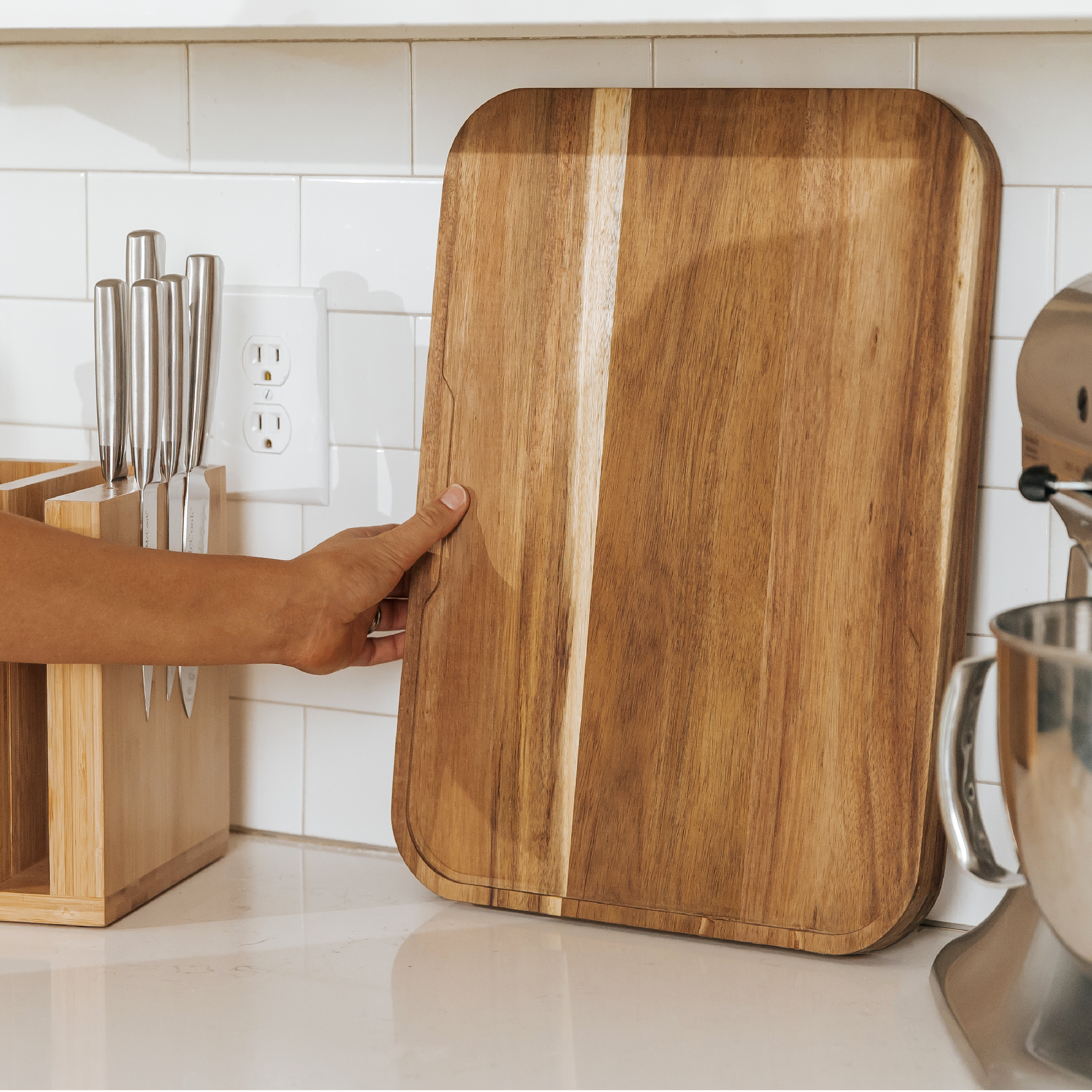 Discover the perfect blend of style and function with our Premium Acacia Nesting Cutting Board. Made of luxurious Acacia wood and includes a nesting Rice Fiber Cutting Board. The main Acacia board has a juice groove to keep your counters clean from spills. Additionally, the integrated wood edges ensure the rice fiber insert remains stable for accurate chopping. Removable rubber feet are added to aid in cleanliness and ensure stability. It is ideal for both professional chefs and home cooks