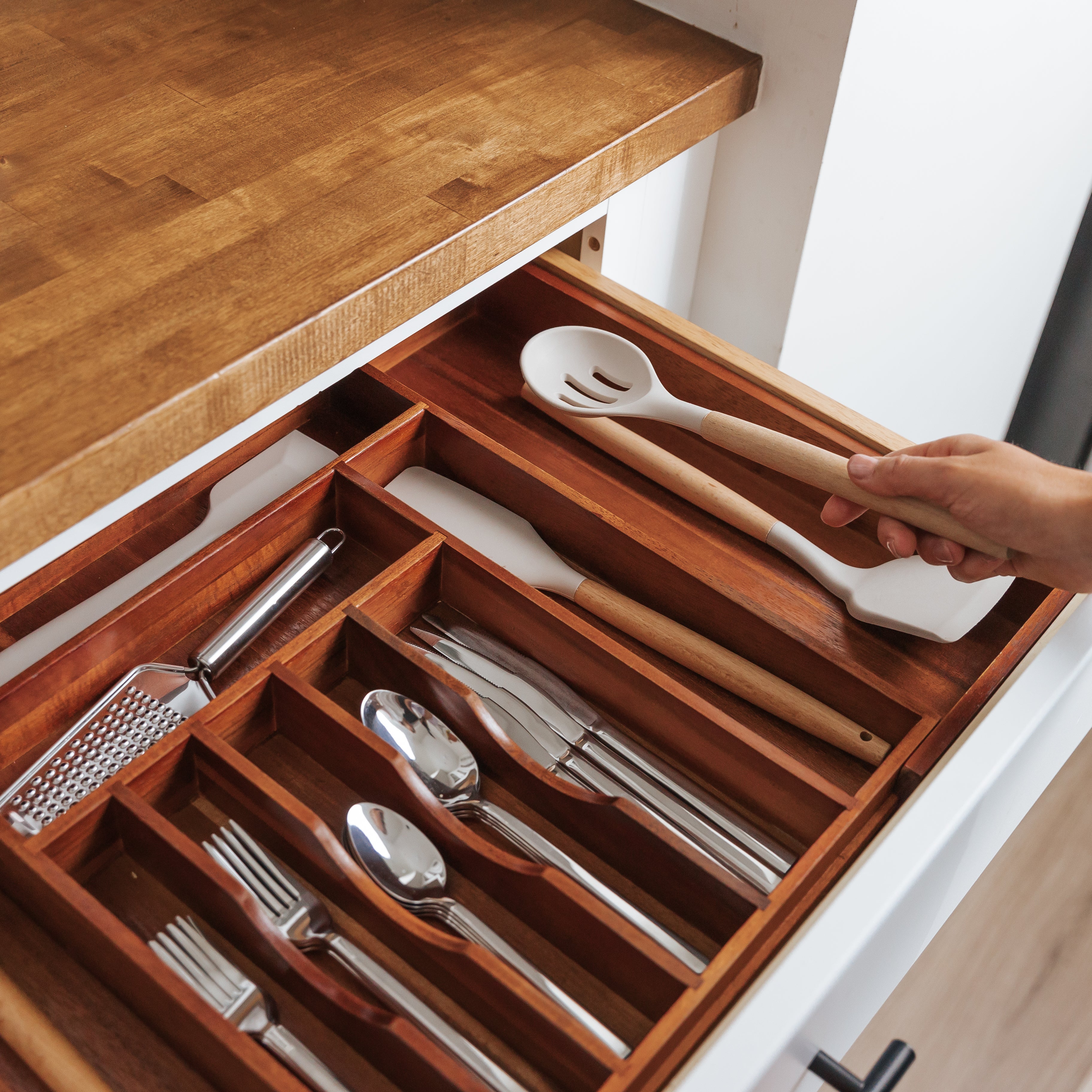 Organize your kitchen with our Acacia Wood Kitchen Drawer Organizer. Made from top-tier acacia wood, this organizer is both stylish and practical. Its customizable design and expandable compartments make it the perfect solution for storing your cutlery, utensils, and kitchen tools.