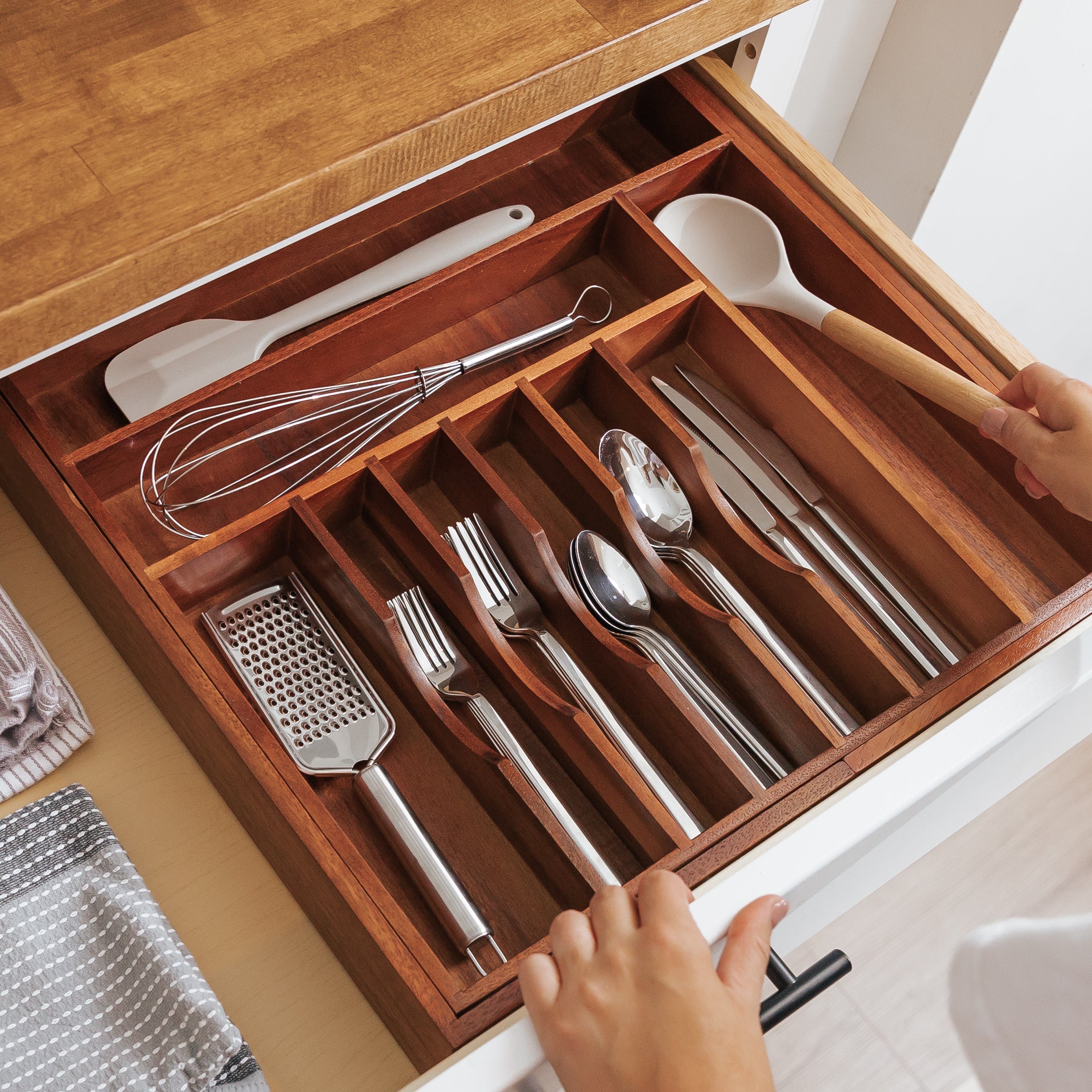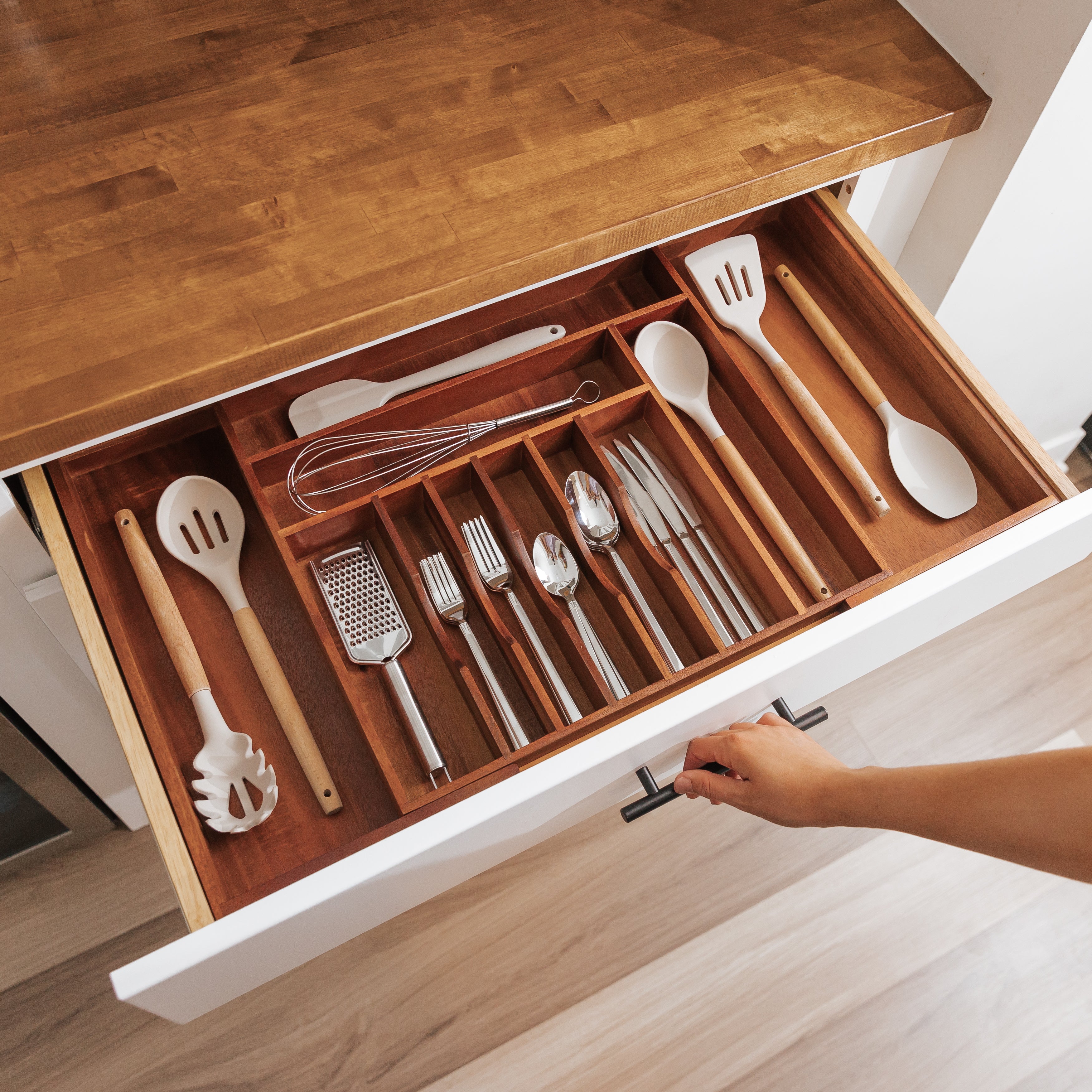 Organize your kitchen with our Acacia Wood Kitchen Silverware Drawer Organizer. Made from top-tier acacia wood, this organizer is both stylish and practical. Its customizable design and expandable compartments make it the perfect solution for storing your cutlery, utensils, and kitchen tools.