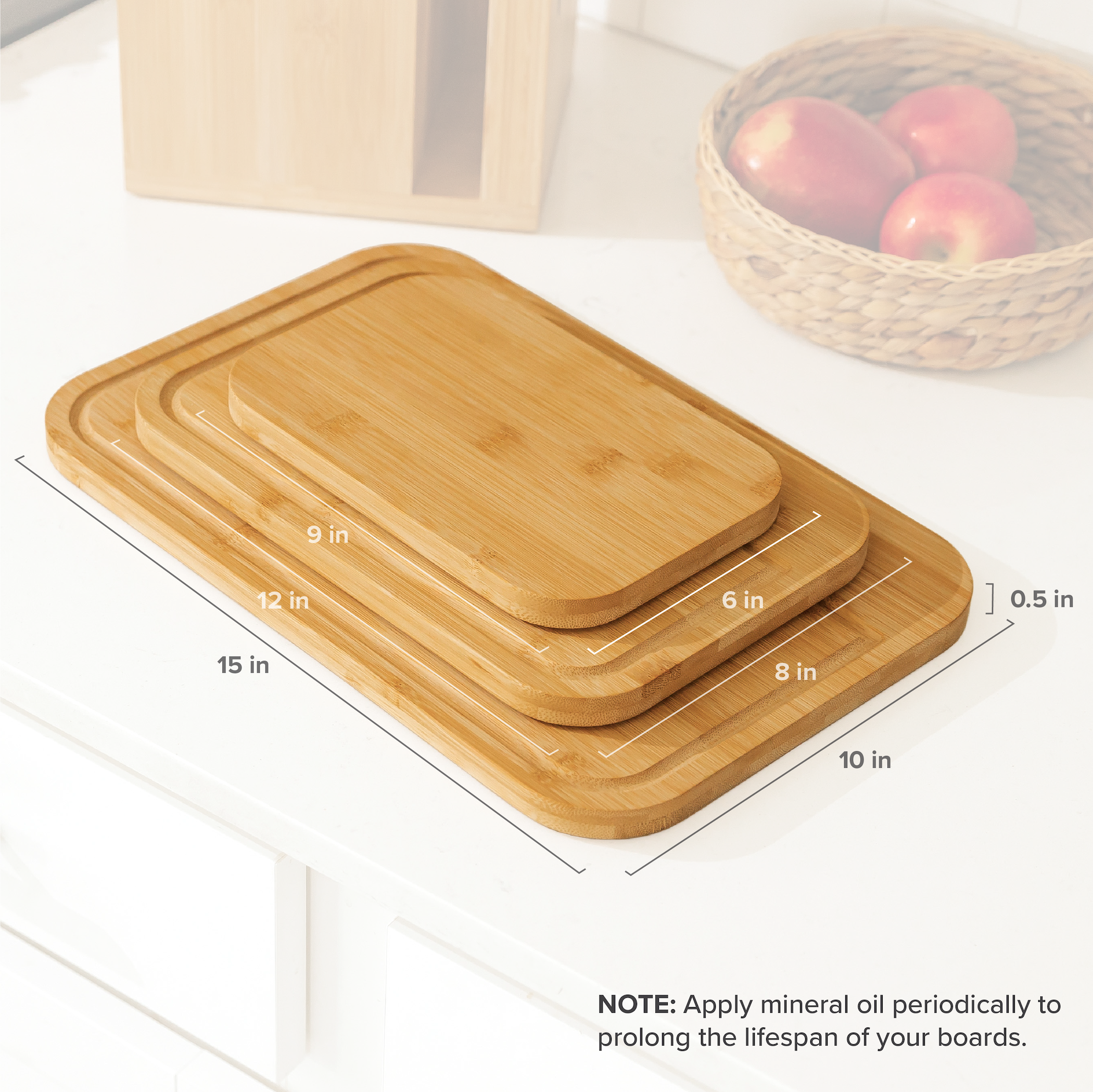 Introducing our durable 3-Piece Bamboo Cutting Board Set with secure rubber feet and juice rims on larger boards. Elevate your culinary experience with style and easy maintenance. Ideal for slicing and chopping, each board comes pre-oiled, ready to use, with a recommendation for mineral oil to extend their life.