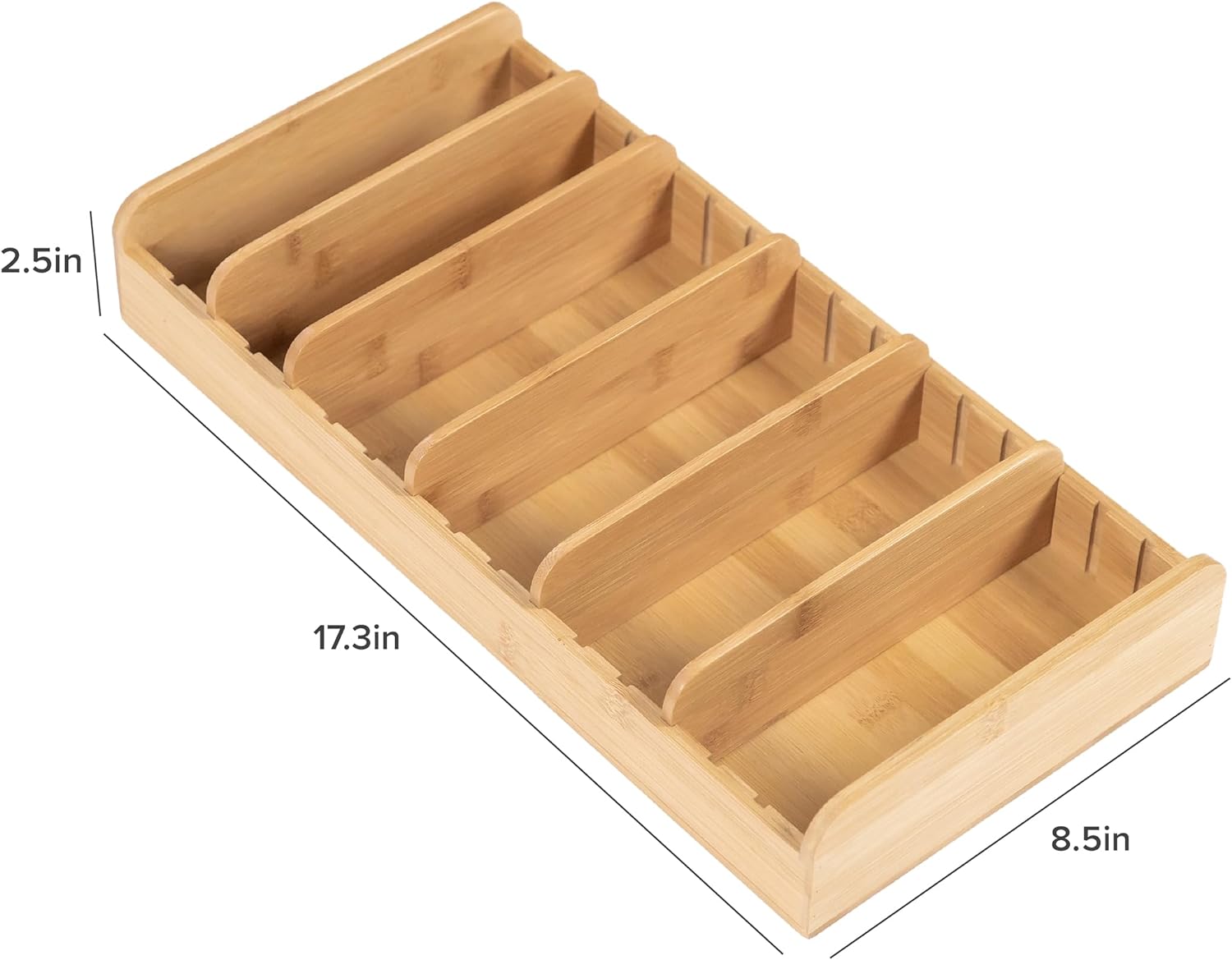 Crafted from durable bamboo, this organizer boasts a modular design featuring adjustable dividers. You can effortlessly tailor the organizer to perfectly accommodate your kitchen towels, food storage lids, and other accessories. It simplifies your kitchen storage, ensuring everything remains neatly arranged and easily accessible.