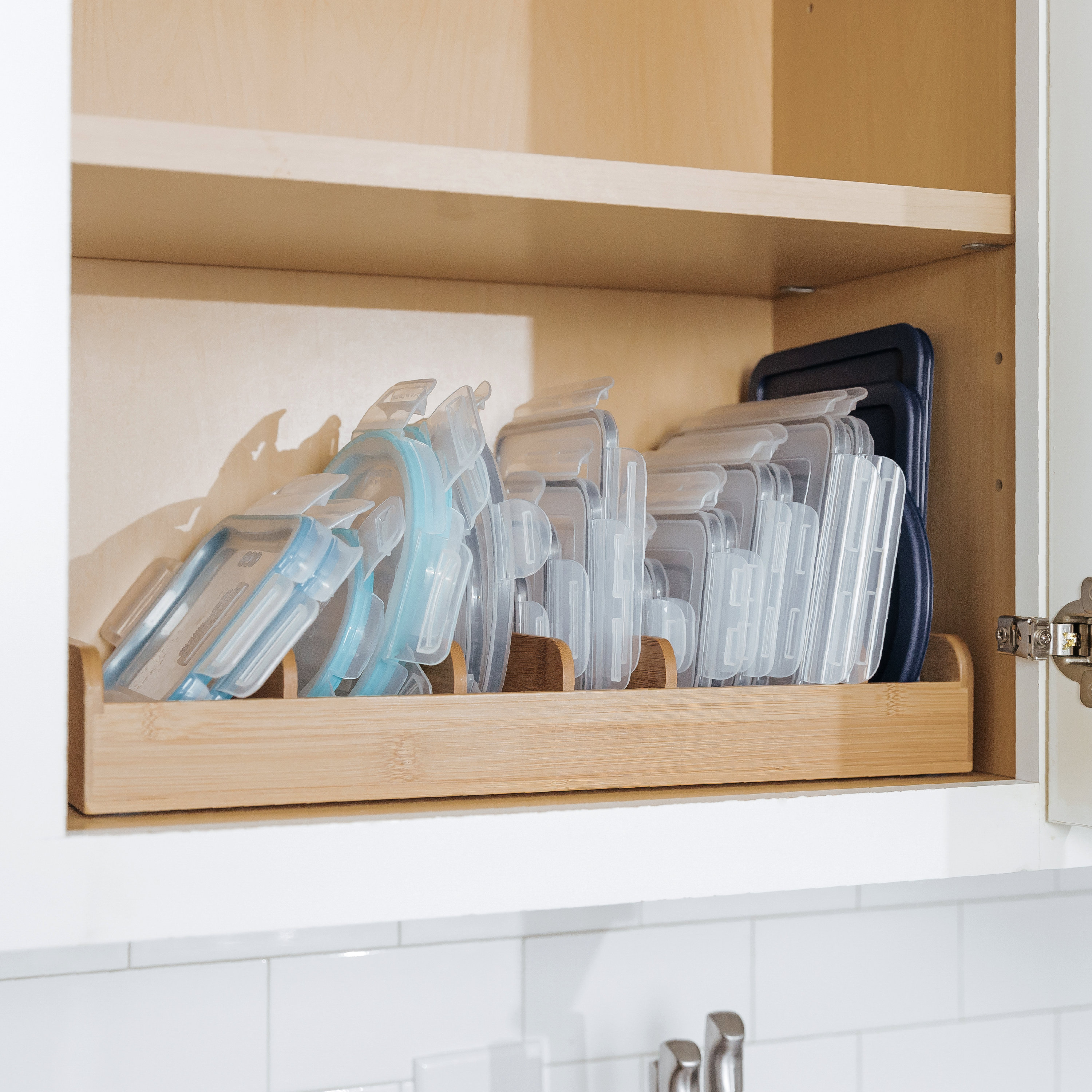 Enhance your kitchen's orderliness and functionality with our Bamboo Towel and Lid Organizer. Crafted from premium-quality bamboo, this stylish and organizer is meticulously designed to simplify your kitchen routine. Say goodbye to cluttered drawers or cabinets and embrace a neatly organized and efficient kitchen setup. With its adaptable design, this organizer provides the perfect solution for elegantly arranging and easily accessing your kitchen towels, food storage lids, and other essentials. Revel in the delight of a well-organized kitchen.