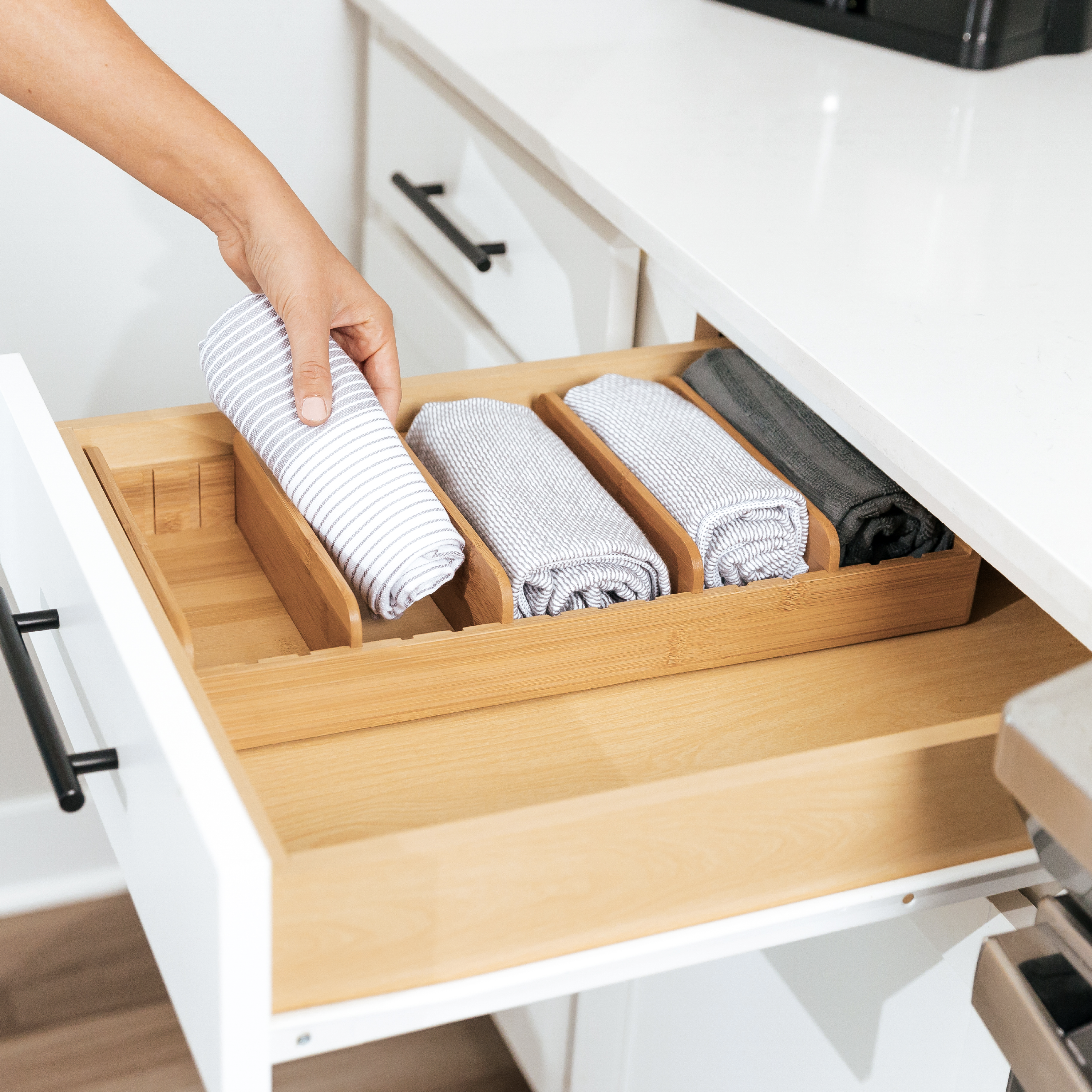 - Organize All Of Your Essentials - Store your towels or food storage lids with ease. Our patented organizer design offers up to 6 compartments (includes 5 adjustable dividers).