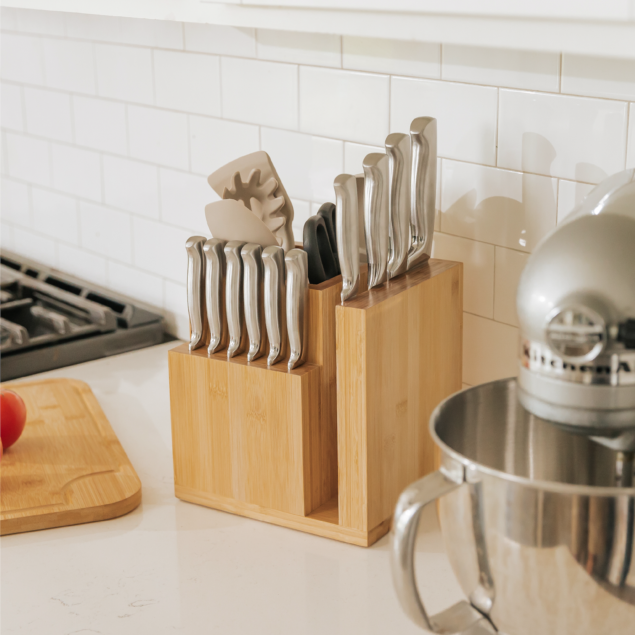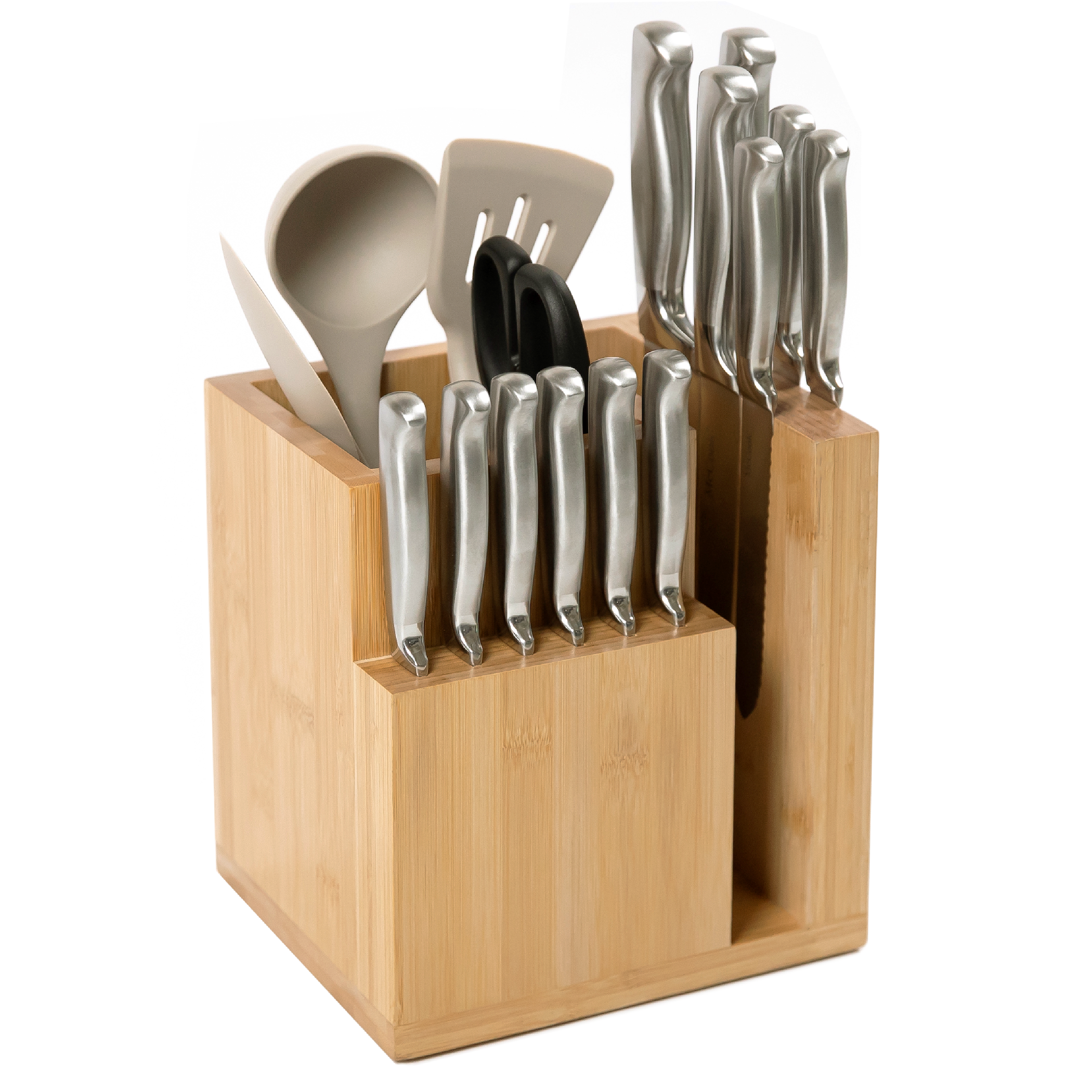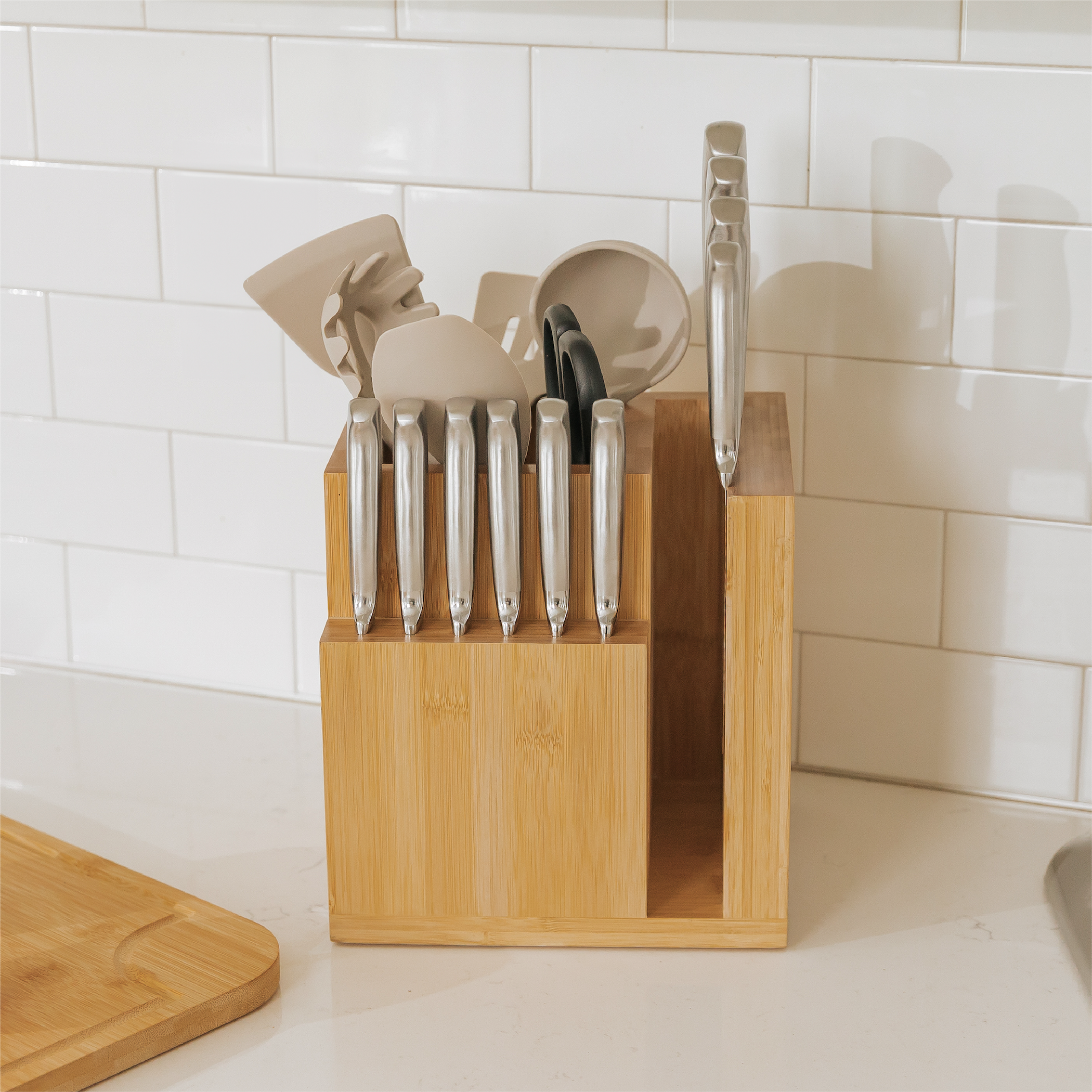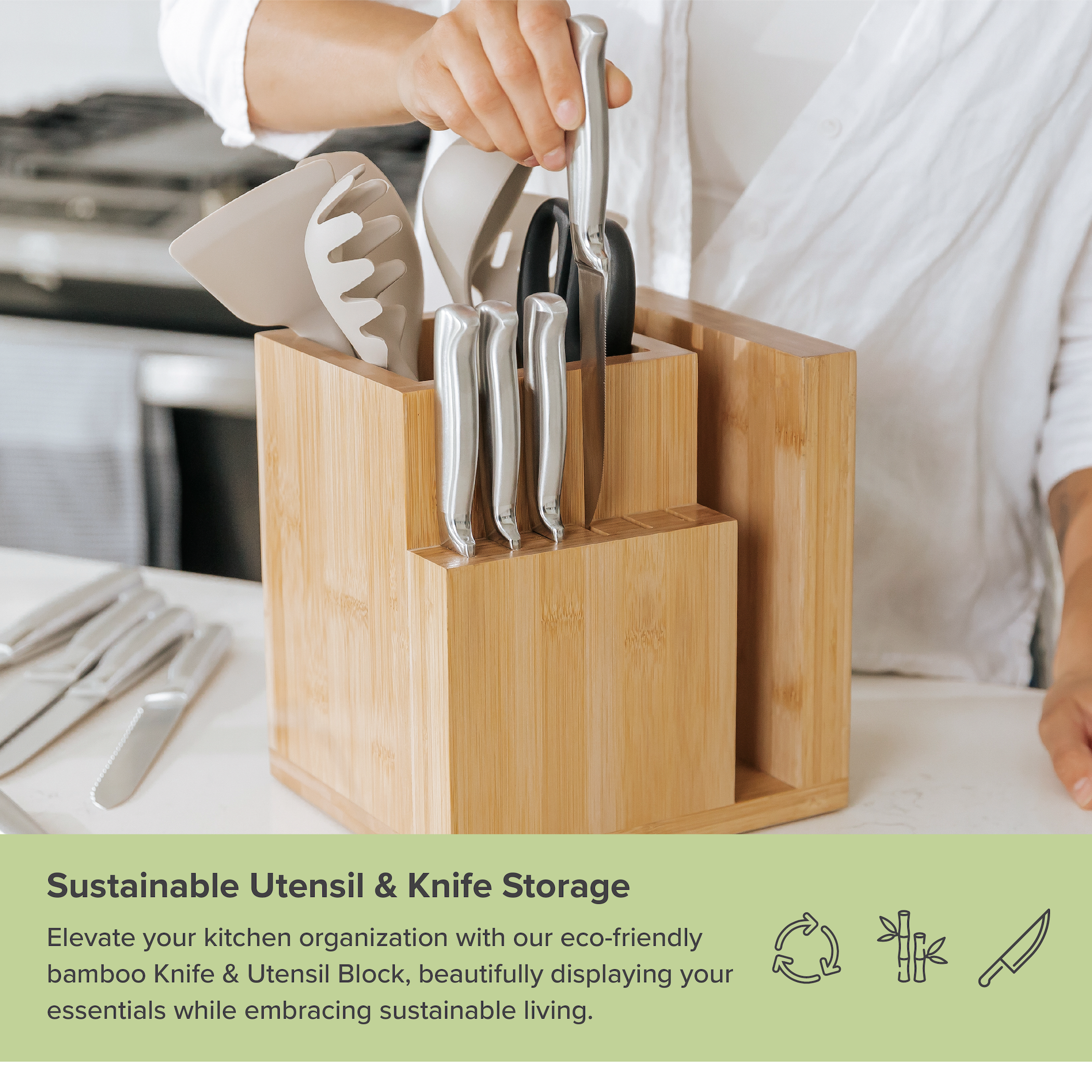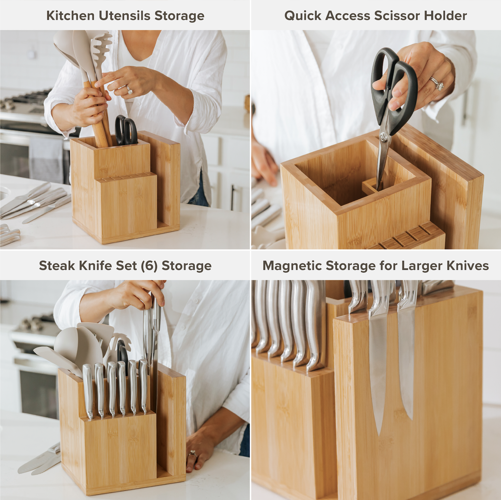 - Versatile Functionality - This Solid Bamboo Kitchen Knife Block holds 6 steak knives and includes an integrated utensil holder for spatulas and spoons, ensuring easy access to essential tools.