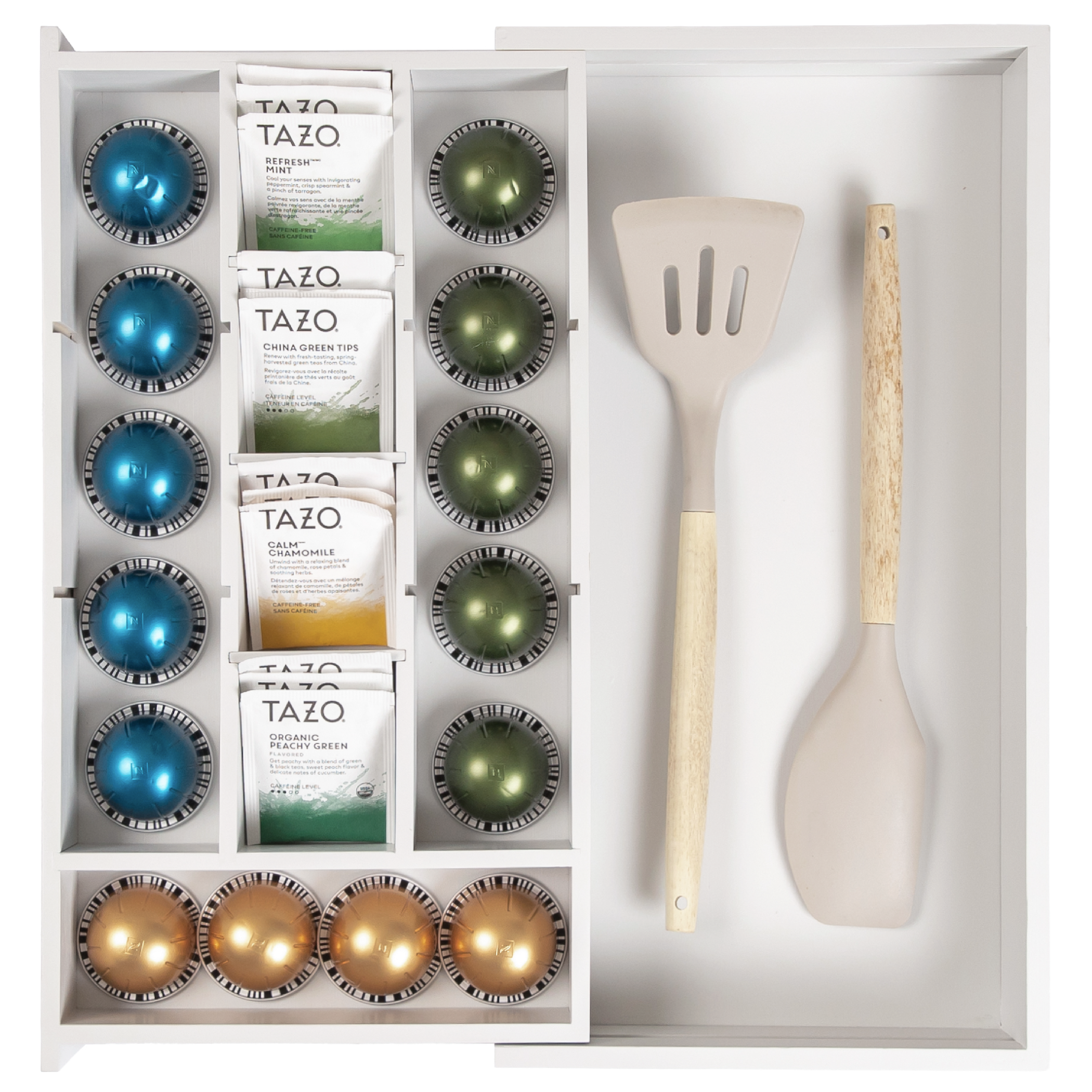This white bamboo organizer adds a modern, stylish touch to your kitchen, providing an elegant way to neatly display and organize tea bags and coffee pods instead of storing them messily in drawers.