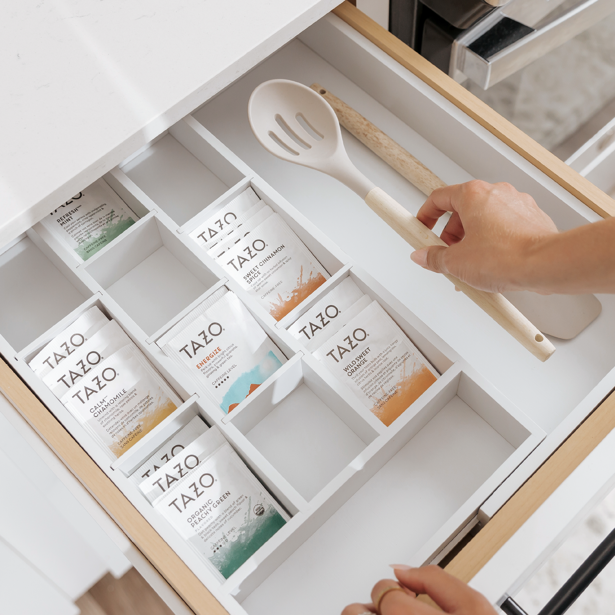 Enhance your kitchen's cleanliness and efficiency with our White Tea Bag and Coffee Pod Organizer. Crafted from premium bamboo, this stylish and environmentally responsible organizer is expertly designed to simplify your tea and coffee routines. Say goodbye to disordered drawers and welcome a meticulously organized, clutter-free kitchen. With its adaptable design and customizable segments, our White Bamboo Tea Bag and Coffee Pod Organizer provides the perfect answer for arranging your tea bags, coffee pods, and brewing essentials neatly and accessing them conveniently. Enjoy the contentment of a well-structured beverage station.