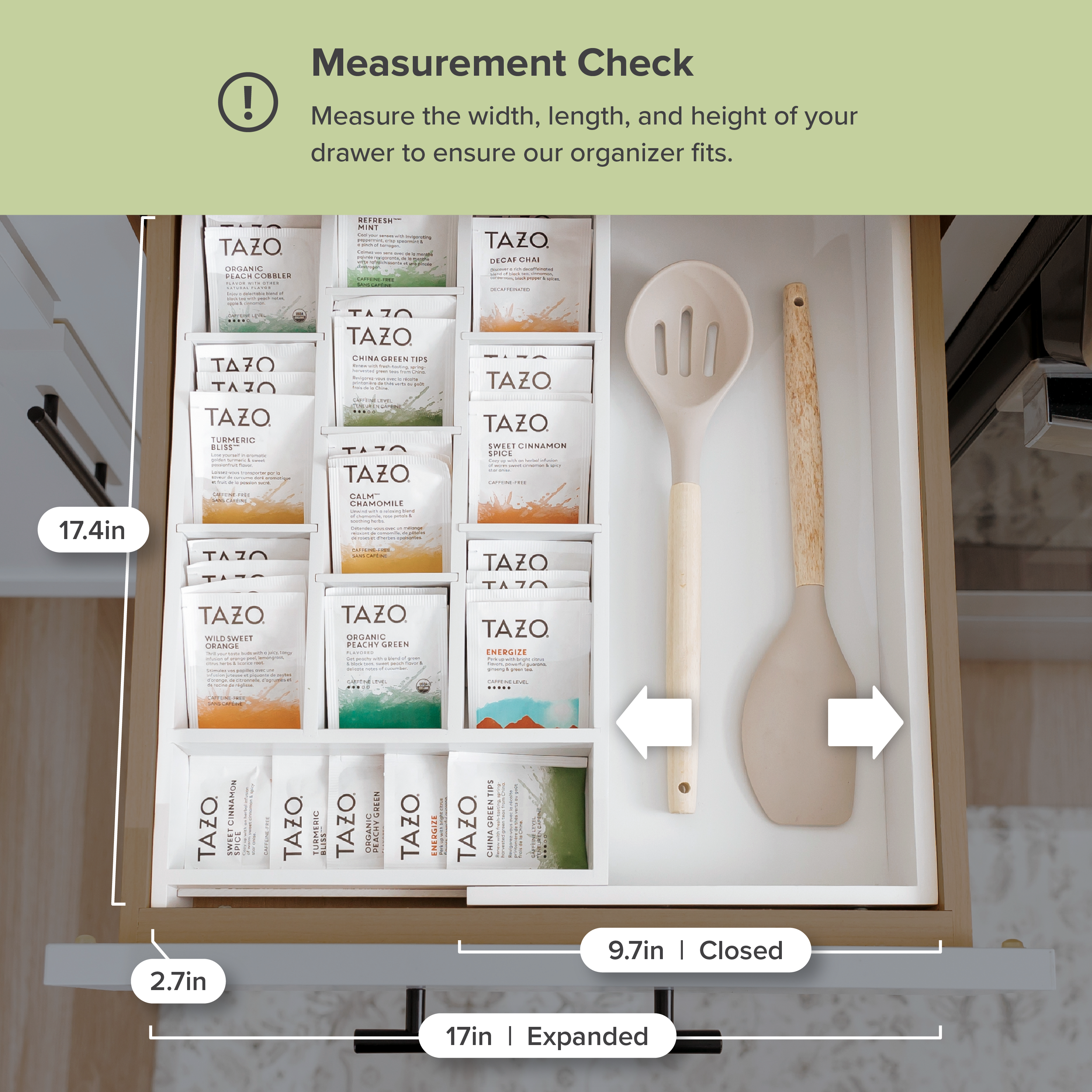 - Maximize Your Drawer’s Storage Capacity - Measures 17.25” long x 2.7” tall, expanding from 9.5” to 17” wide. The extra 0.5” height adds significant storage for tea bags and coffee pods compared to other organizers.