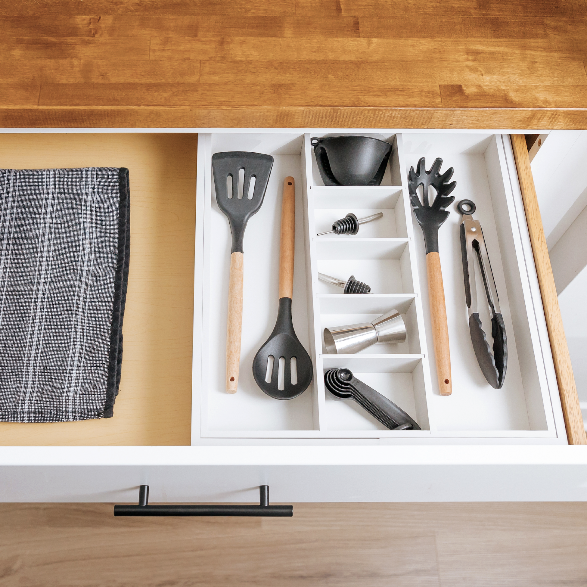 Crafted from durable, eco-friendly bamboo, this white organizer features a modular design with adjustable dividers, allowing you to personalize the compartments to suit your needs. This premium organizer simplifies your kitchen storage, maintaining a neat arrangement for your utensils, cutlery, and gadgets.