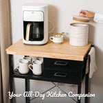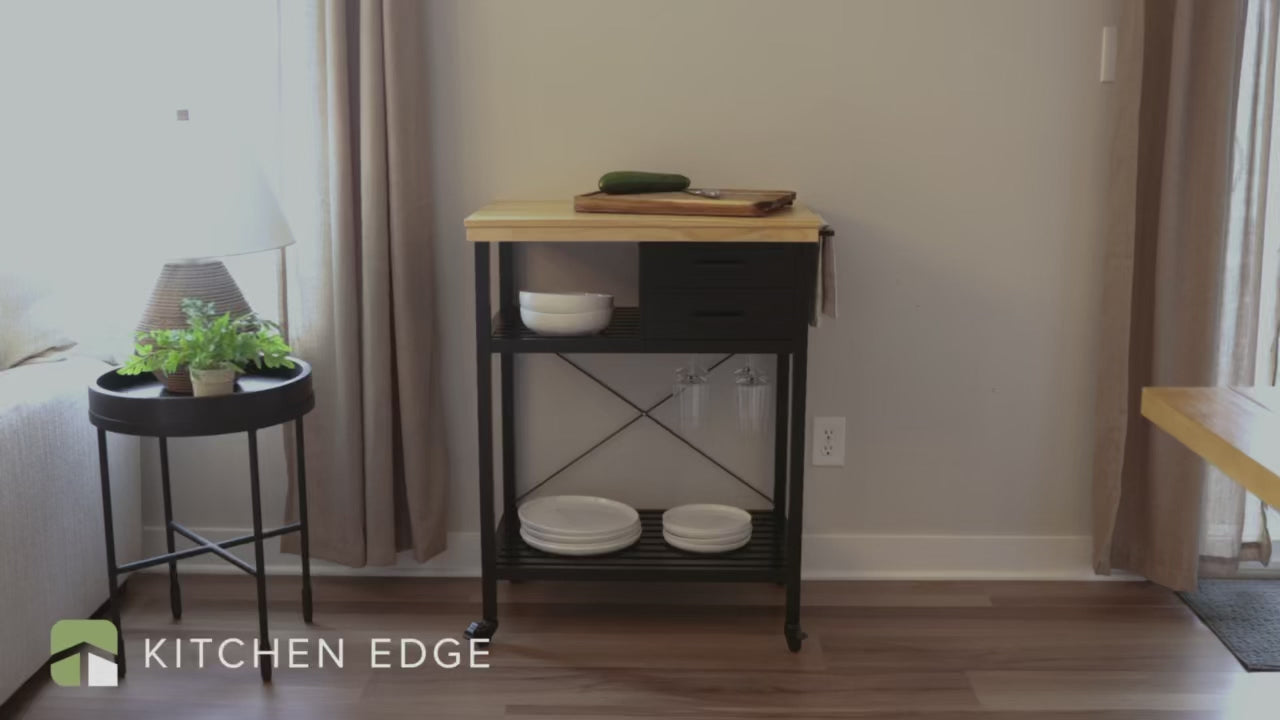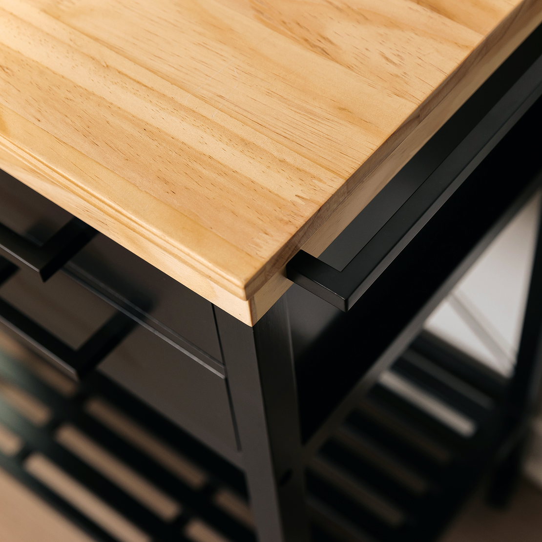 A natural pine wood top and matte black frame create contrast and warmth. This wood and metal kitchen cart blends effortlessly with modern, farmhouse, or transitional spaces.