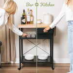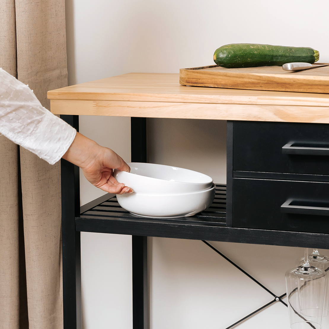 Two drawers, dual wood shelves, and a built-in wine rack keep everything organized—from bar tools and dinnerware to prep essentials. A flexible storage cart for everyday use or entertaining.