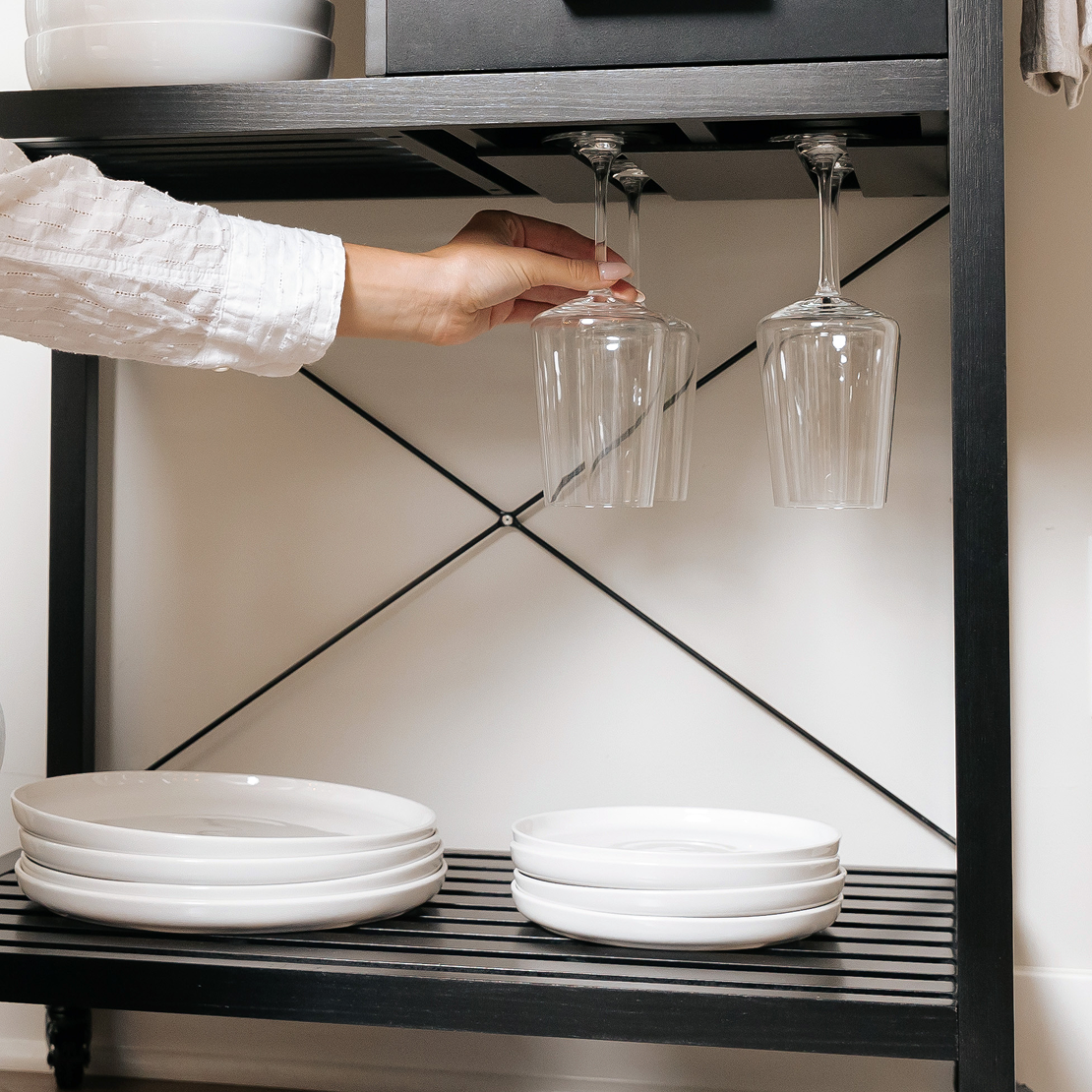 Store up to 6 wine glasses with the integrated solid wood rails—perfect for cocktail hour or dinner guests. Easy to grab, hard to forget.