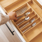 Organize your kitchen effortlessly with our KitchenEdge™ Bamboo Cutlery Drawer Organizer. Expands to 33", fitting extra-wide drawers up to 19" deep. Crafted from eco-friendly bamboo, this stylish and functional organizer ensures a tidy and clutter-free kitchen. Its adaptable design and expandable compartments make accessing utensils and tools convenient, bringing satisfaction to your well-organized kitchen.
