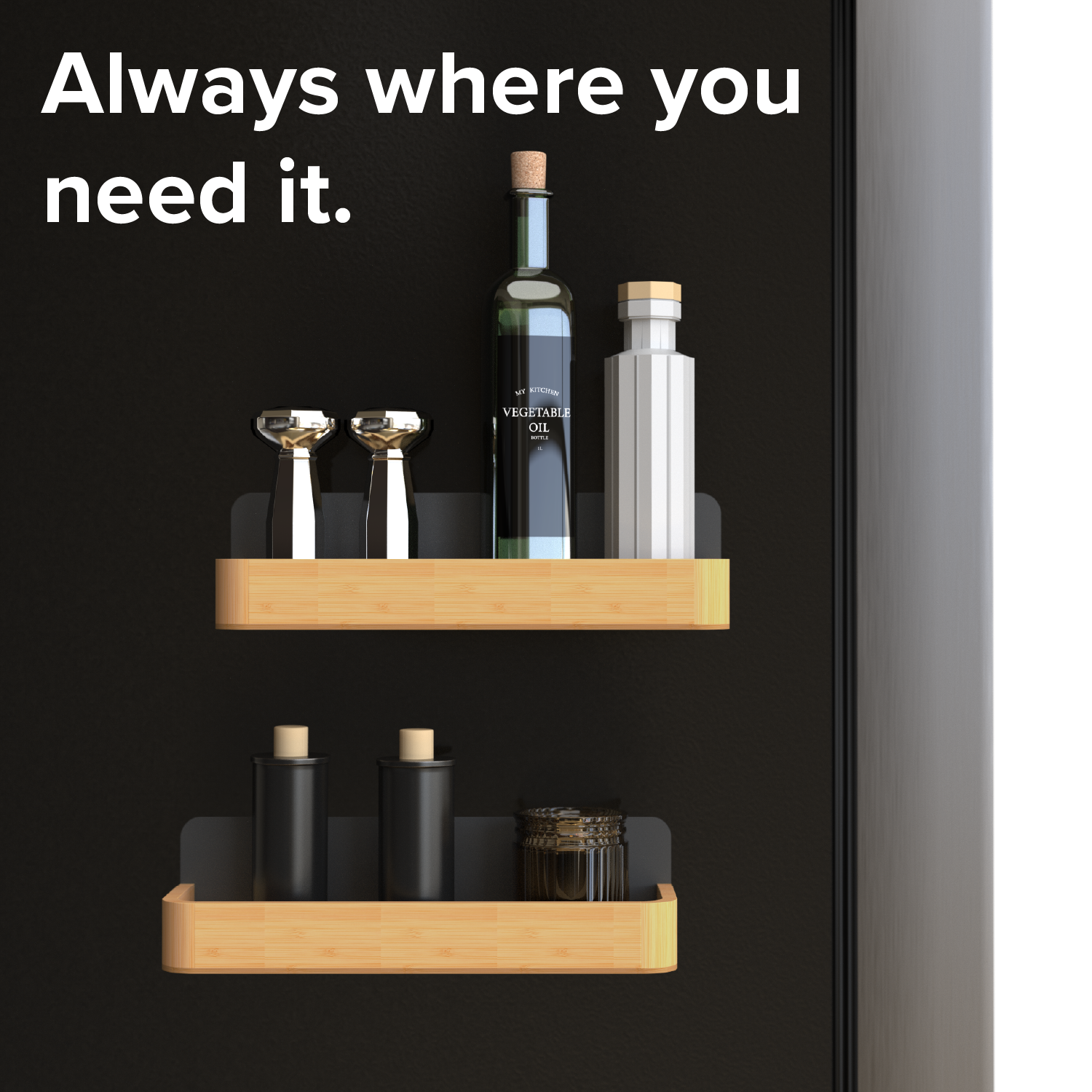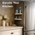 A sleek magnetic shelf set with a matte black metal back and bamboo base that adds stylish, space-saving storage to any kitchen. Each shelf holds up to 10 lbs and attaches easily to metal surfaces like refrigerators, making it ideal for spices, oils, and everyday essentials. Compact yet roomy, with rounded corners for a modern look, it turns unused vertical space into organized, accessible storage.
