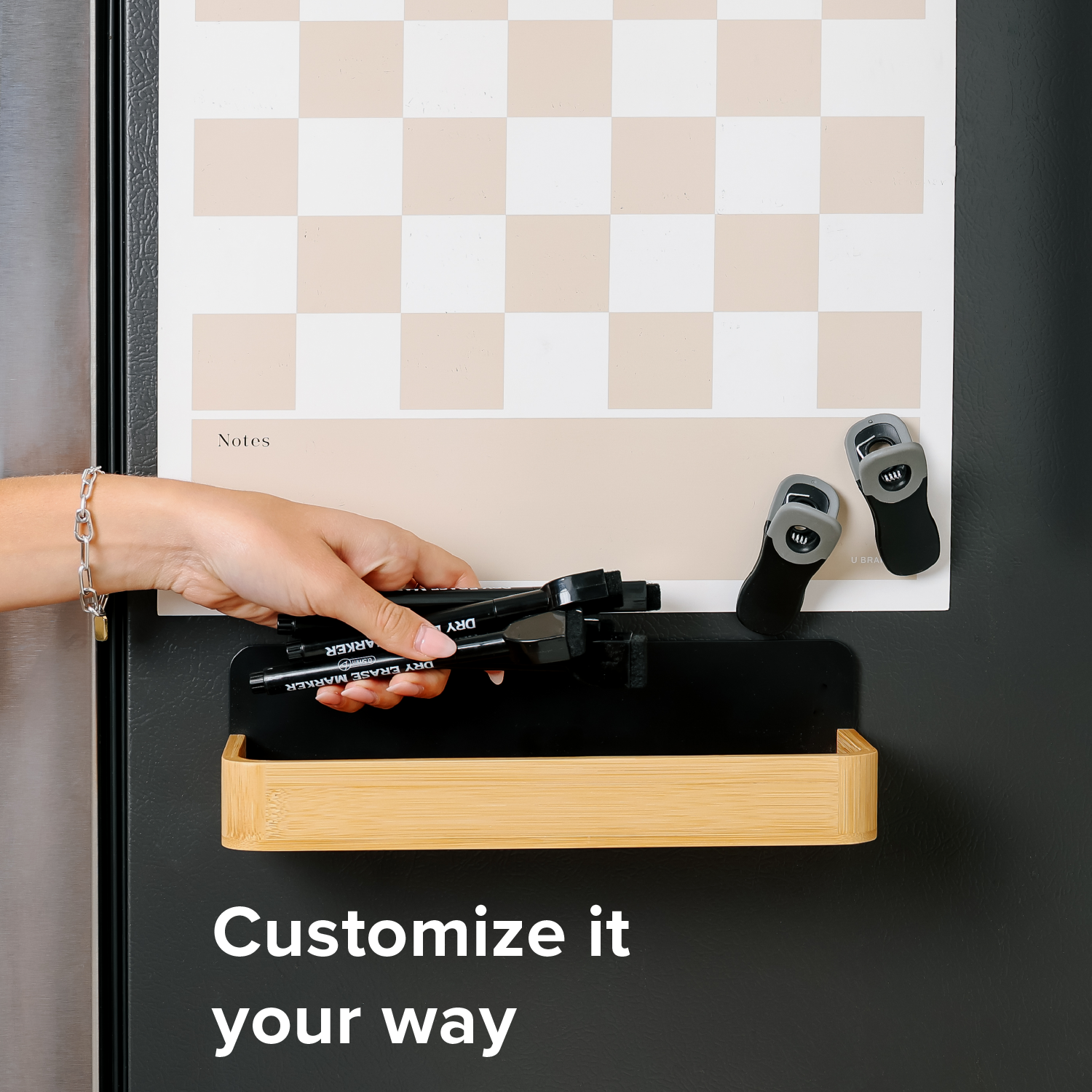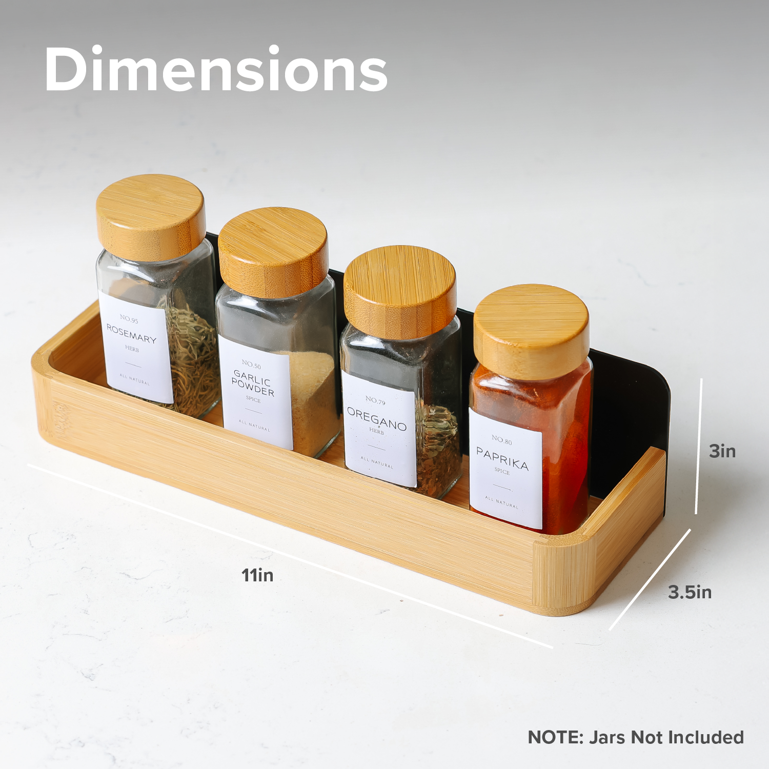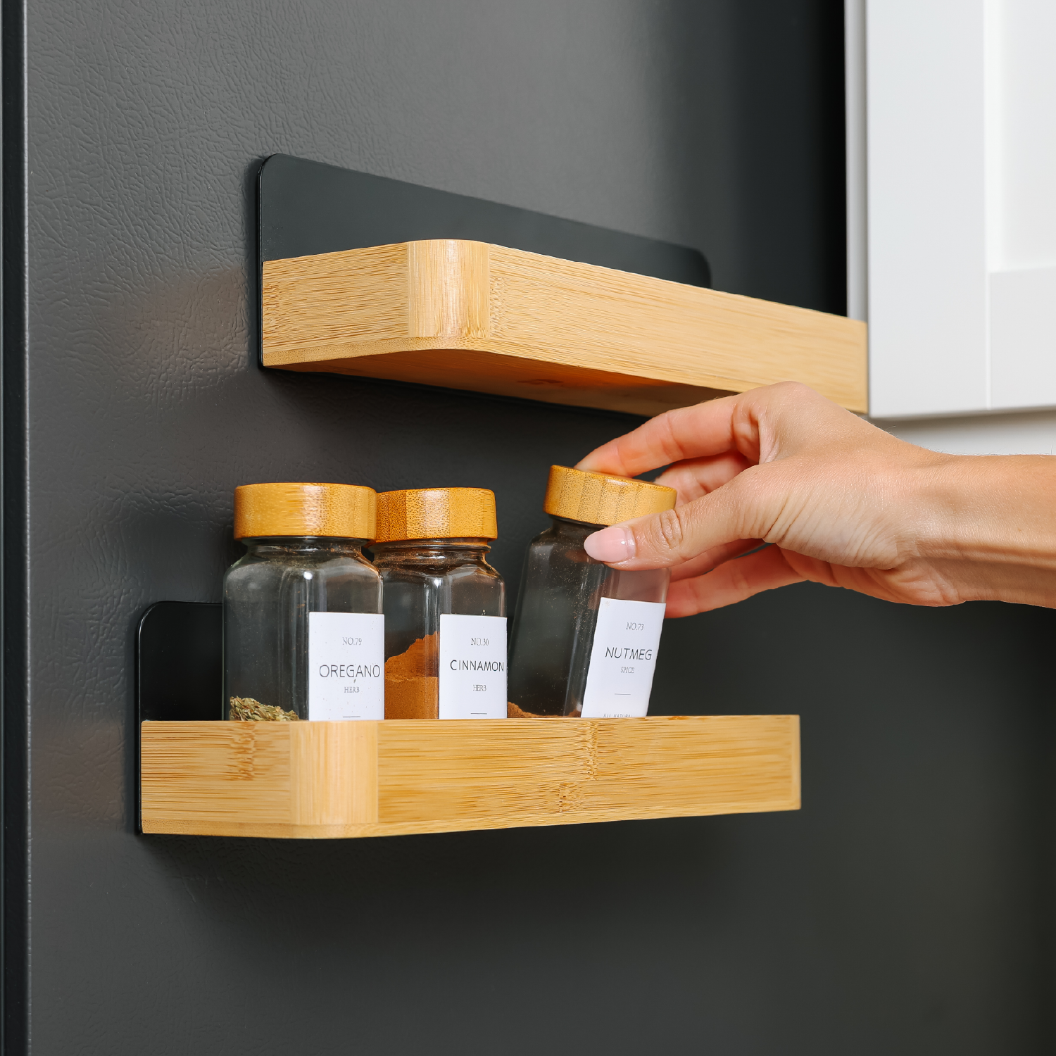 MATTE BLACK METAL WITH NATURAL BAMBOO BASE: Modern black metal backing paired with a warm bamboo base for a clean, elevated magnetic spice rack look.