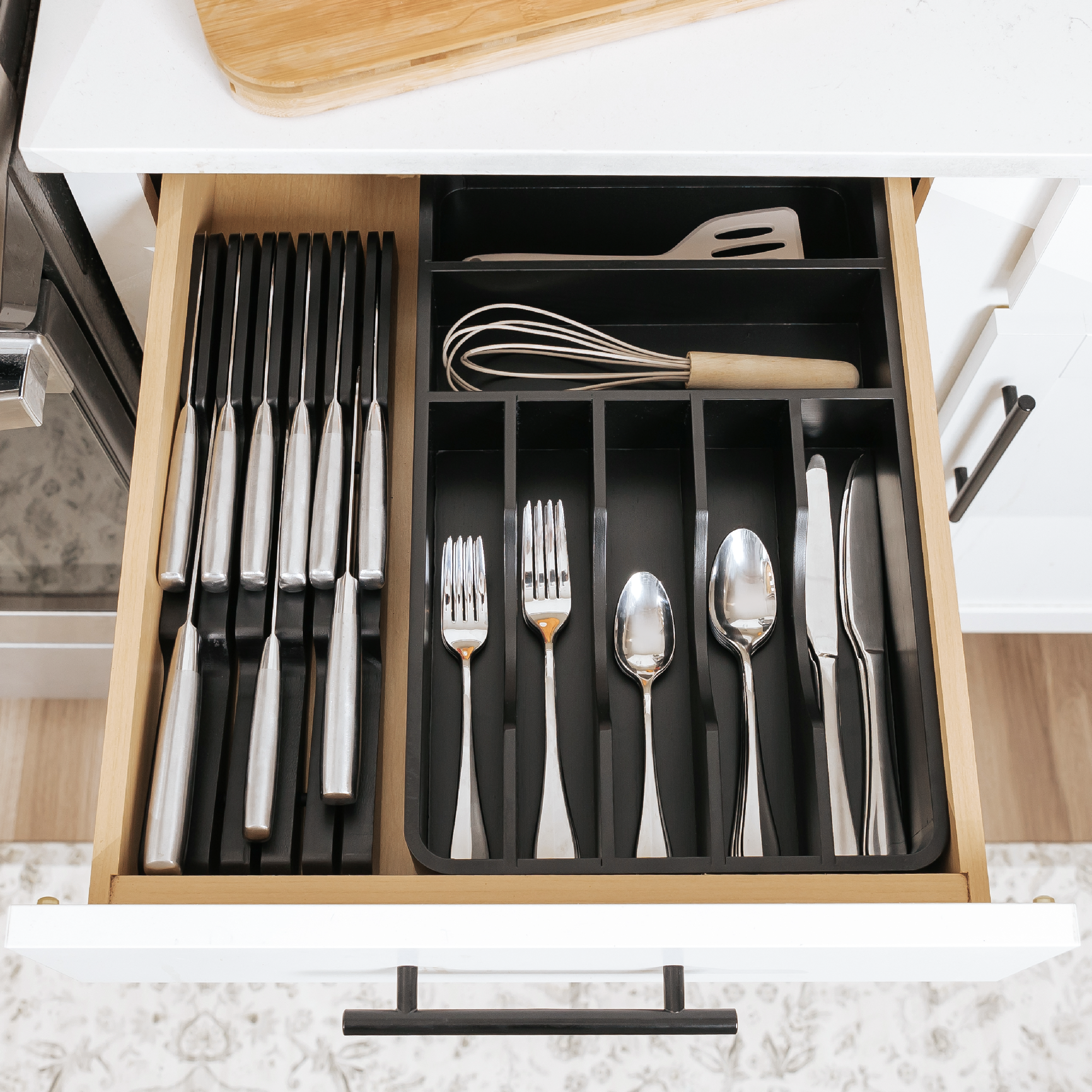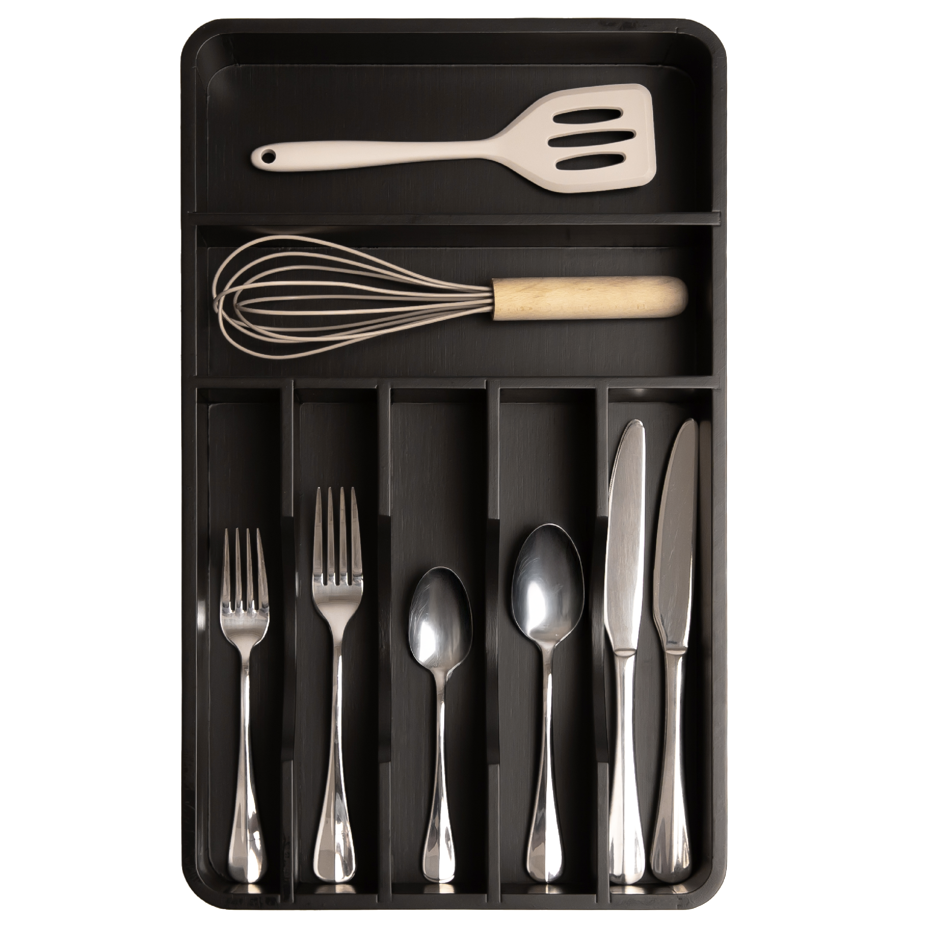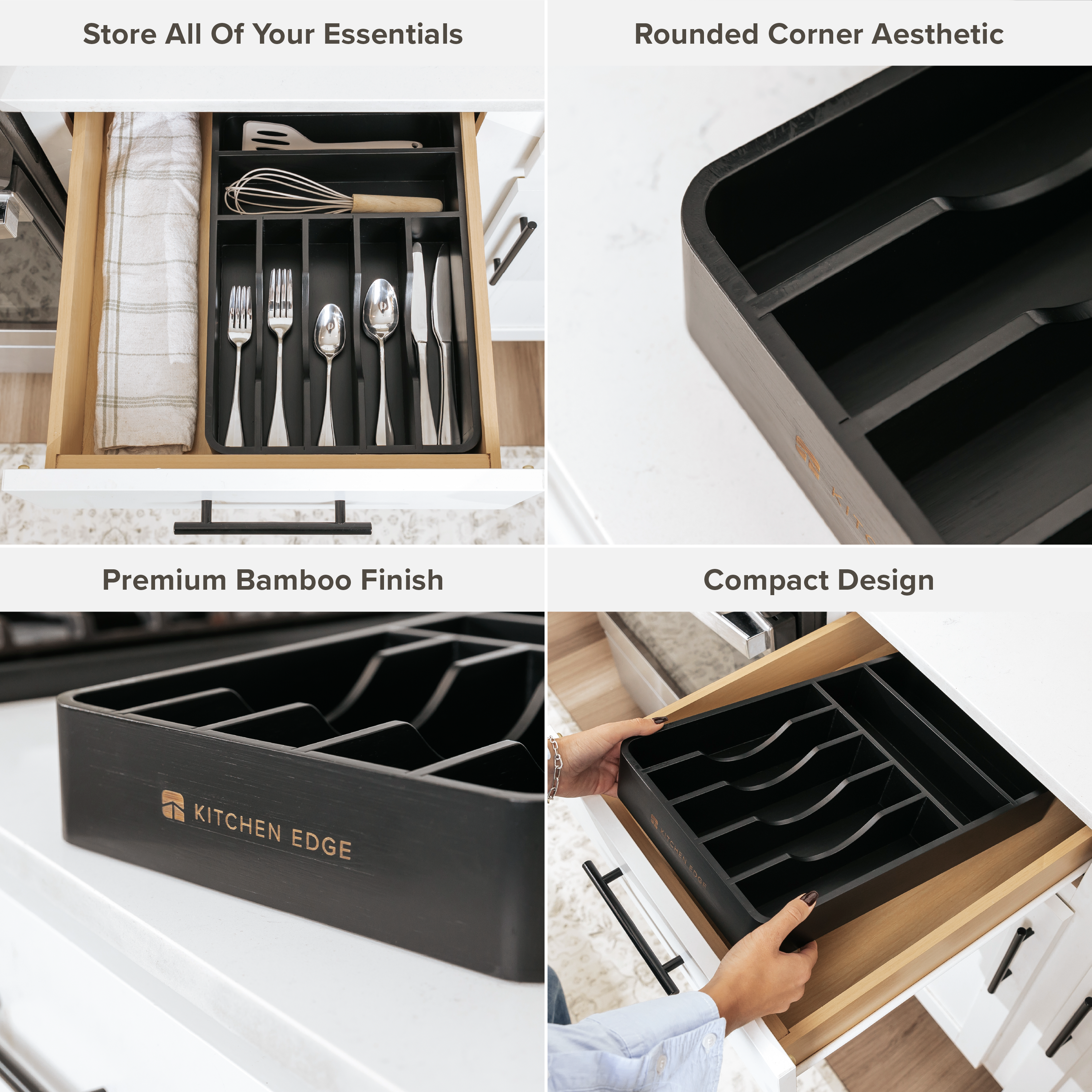 With a sleek black finish and durable bamboo construction, this silverware drawer organizer adds a touch of elegance to your kitchen while providing ample storage space for all your essentials.
