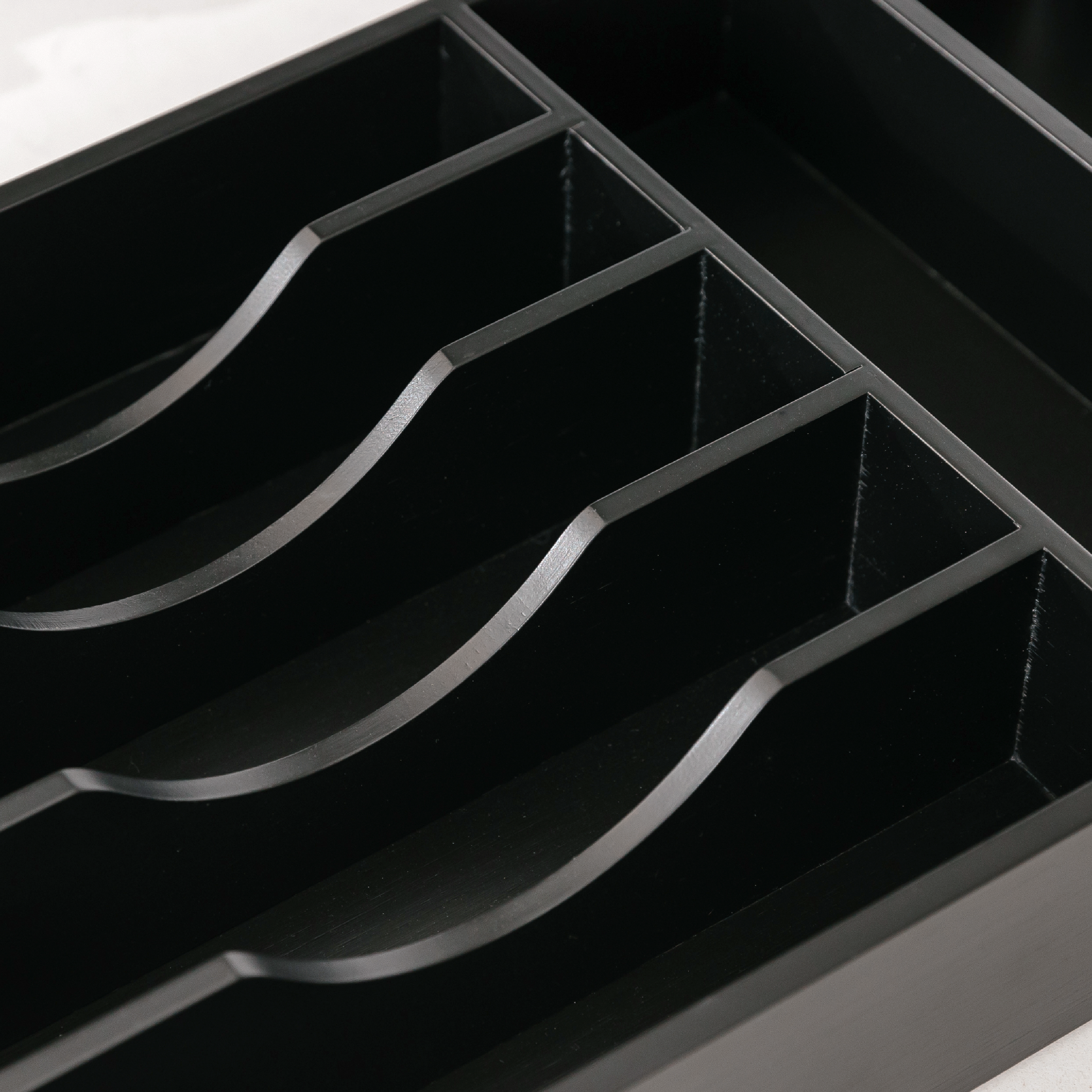 Keep your kitchen neat and chic with this black-painted bamboo drawer organizer! Made from sturdy, eco-friendly bamboo, it fits drawers 11” or wider and offers seven spacious compartments to organize utensils, cutlery, and gadgets with ease.